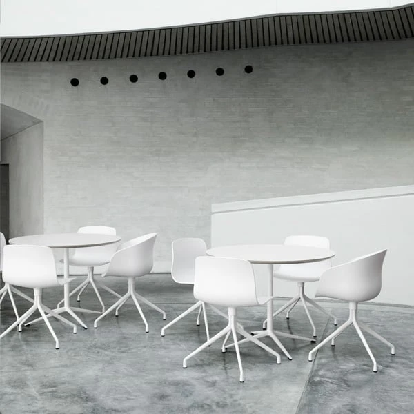 About A Chair AAC10 by HAY combines an aluminium swivel base with a softly shaped polypropylene shell. A result of close collaboration between designer Hee Welling and HAY, About A Chair is a collection of outstanding simplicity and combinability. With About A Chair collection, Welling wanted to reach a new level in the combination of shape, function, comfort, detail, and esthetic. The idea behind the collection was to develop a chair which works well around the dining table, around a conference table, as well as in a restaurant, cafeteria or at the office. Due to their simple and plain design, the chairs can be combined with many types of furniture and interiors.
