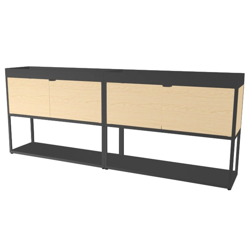New Order shelving package with sliding doors includes the following elements in a width of 100 cm: 2 x shelf bottom, 2 x shelf middle, 2 x tray top, 2 x wooden panels (2 side + 1 back), 2 x wooden sliding door, 2 x handle for wooden door, 2 x double profile base, 4 x single profile base.