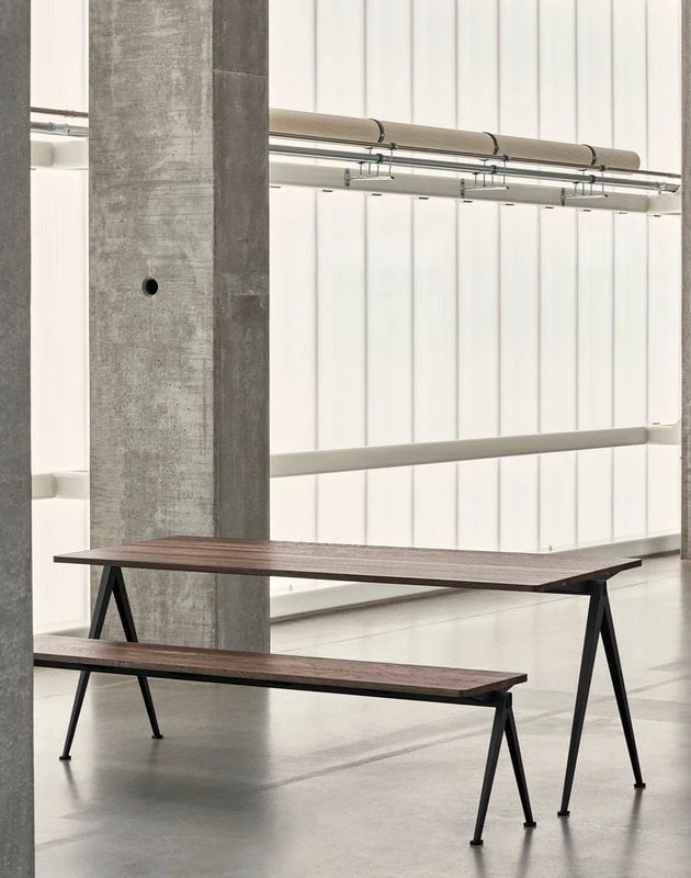 The Pyramid bench 12, by HAY in collaboration with Ahrend, is inspired by the design of the Pyramid table by Wim Rietveld. A simplistic combination of an angular steel frame and rectangular oak top, the Pyramid bench was regarded in the 1950s as a masterpiece in the innovative use of sheet steel, and it has maintained its fresh appearance until today. The Pyramid bench can be combined with the Pyramid table or used as a side bench or small side table anywhere in the house. Pyramid benches are available in different sizes and combinations of base colours and wood finishes.